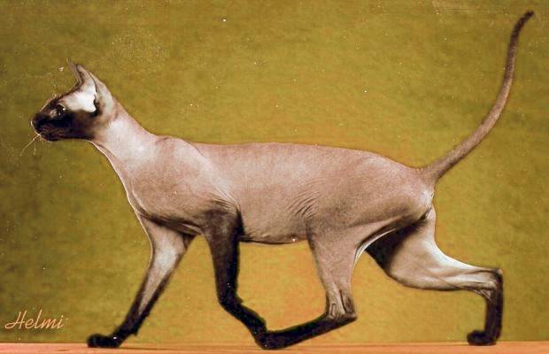 Kucing 'botak' ini berasal dari Rusia. Sama seperti Spyhnx, kucing ini sebenarnya memiliki bulu sangat pendek dan halus yang kasat mata. Seekor Peterbald memiliki sosok elegan ramping dengan bentuk kepala khas: sempit dan panjang dengan profil lurus, mata berbentuk almond, dan telinga besar. Mereka kehilangan gen rambut dan kulit mereka memiliki warna penampilan abu-abu.